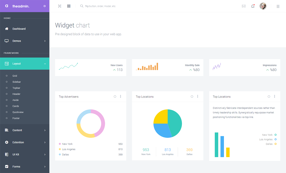 TheAdmin design is harmonious, clean and user friendly. Even though the template has a lot of content, it doesn’t looks messy and all files and code are well structured, commented and divided. TheAdmin has a huge collection of plugins and UI components and works seamlessly on all major web browsers, tablets and phones.